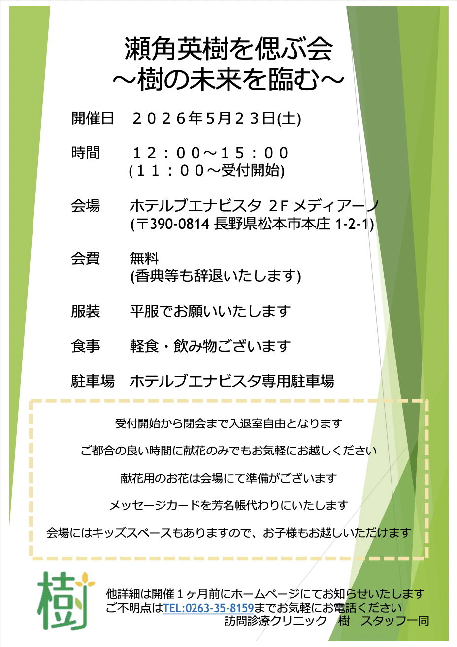新しく生まれた訪問診療クリニック樹、皆さまのご支援とご協力で育てて頂ければ幸いです。よろしくお願い致します。
